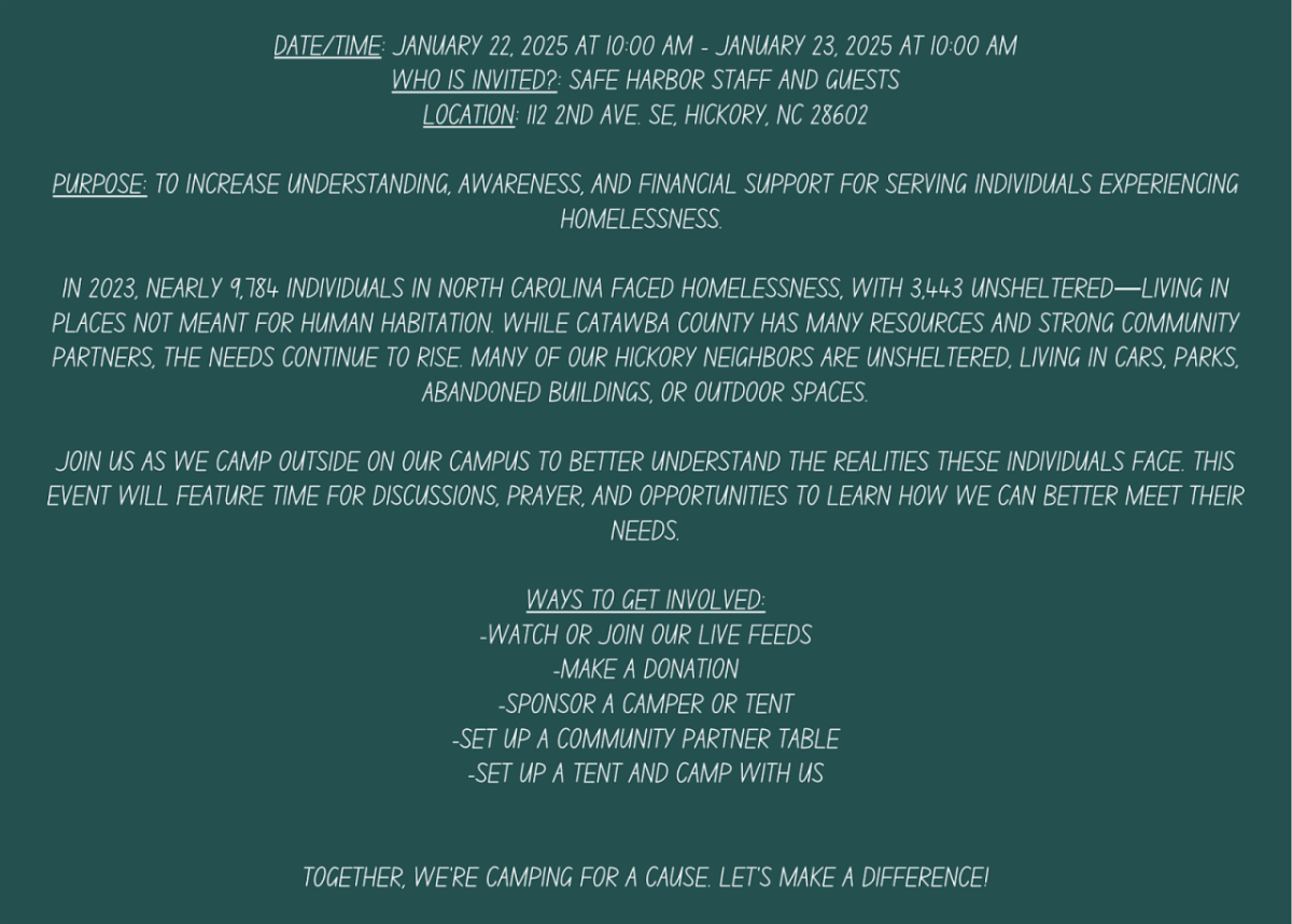 The Salvation Army of Greater Hickory - Helps restore security and hope to individuals and families through its Shelter of Hope and Transitional Housing programs - Information: https://www.facebook.com/SalvationArmyGreaterHickory - 828-322-8061