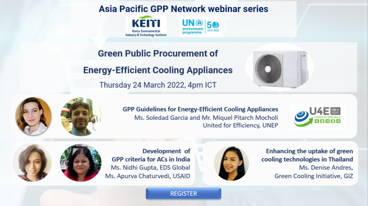 In the first quarter of 2022, U4E’s resources on sustainable public procurement also helped support third party activities and resources. In March 2022, the U4E Green Public Procurement Technical Guidelines and Specifications for Energy-efficient Refrigeration Appliances and Air Conditioners were featured as part of the Asia Pacific Green Public Procurement Network webinar series aimed at sharing knowledge and networking on sustainable public procurement in the Asia Pacific region. The webinar provided an introduction to U4E’s work, presented the main recommendations from the guidelines and included case studies from India and Thailand.