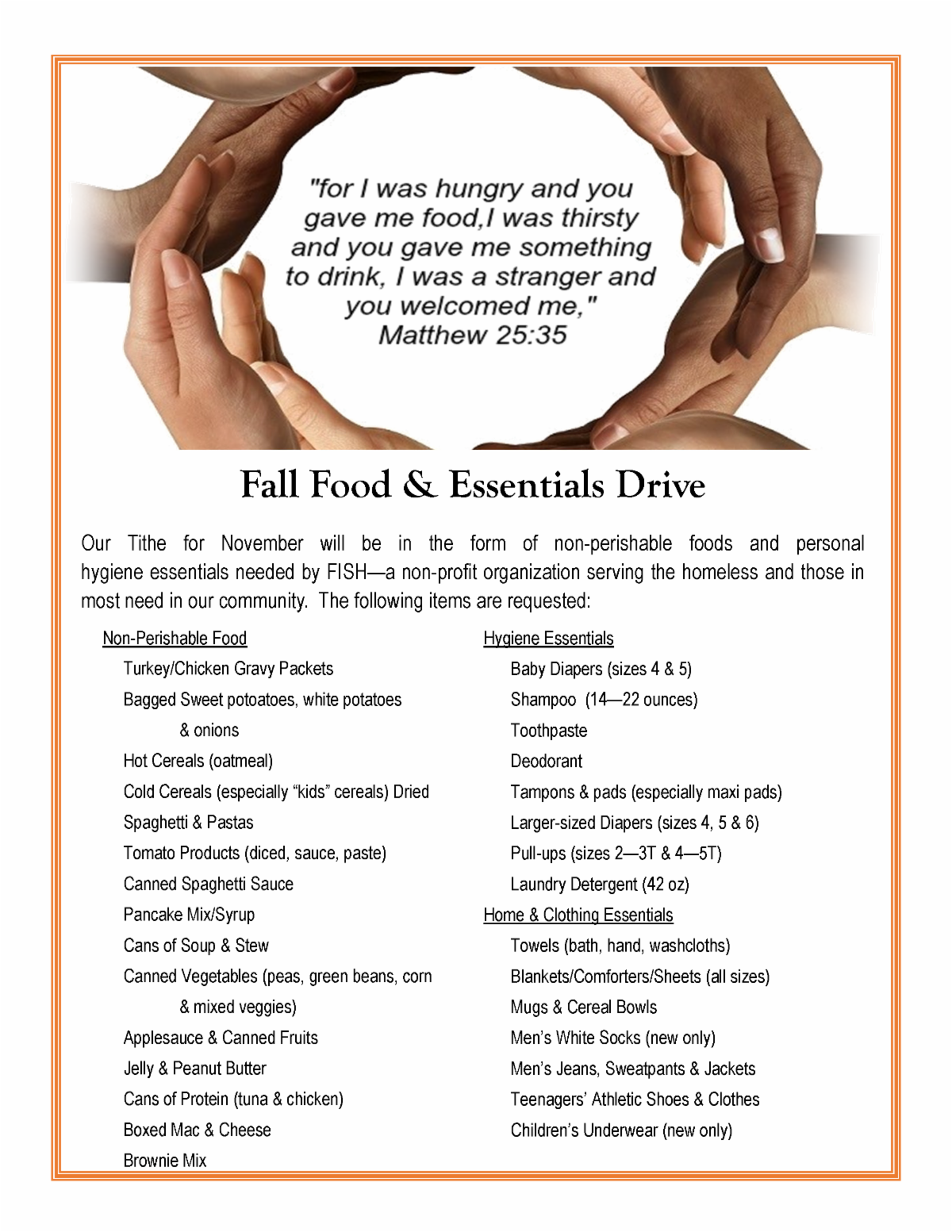 This is our final week of our November Food Drive and we want to thank everyone who has participated this season! We will continue to collect donations through this Sunday before we make a final drop off to FISH, an organization supporting those in need in our local community. Lists of most-needed items are available in this newsletter and in the UWSC foyer. Together, we are love in action!