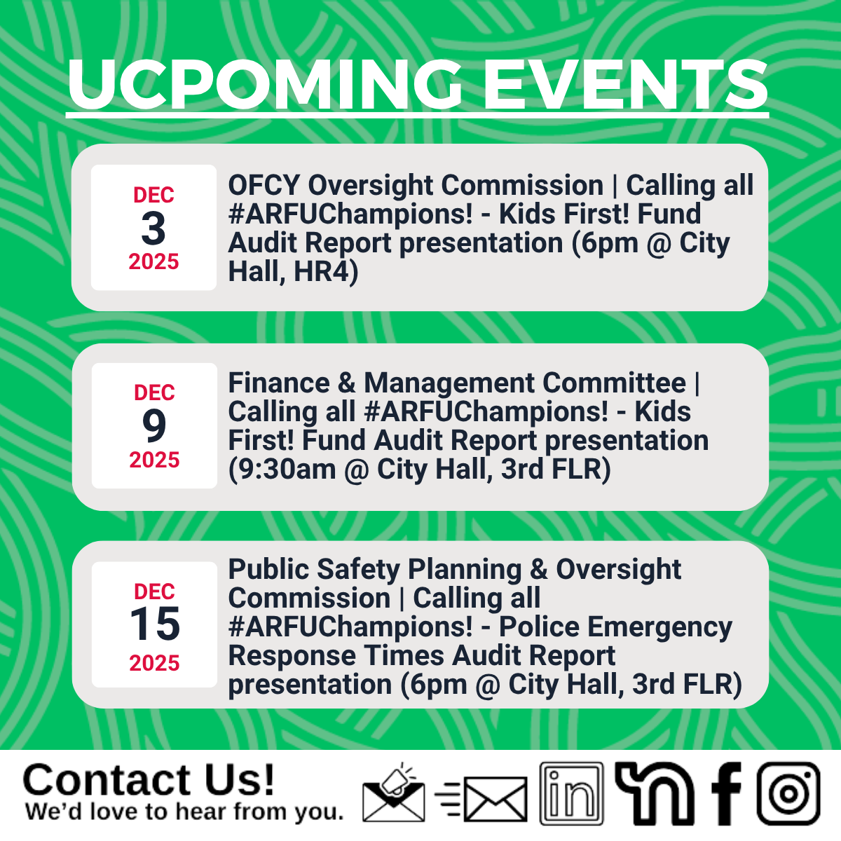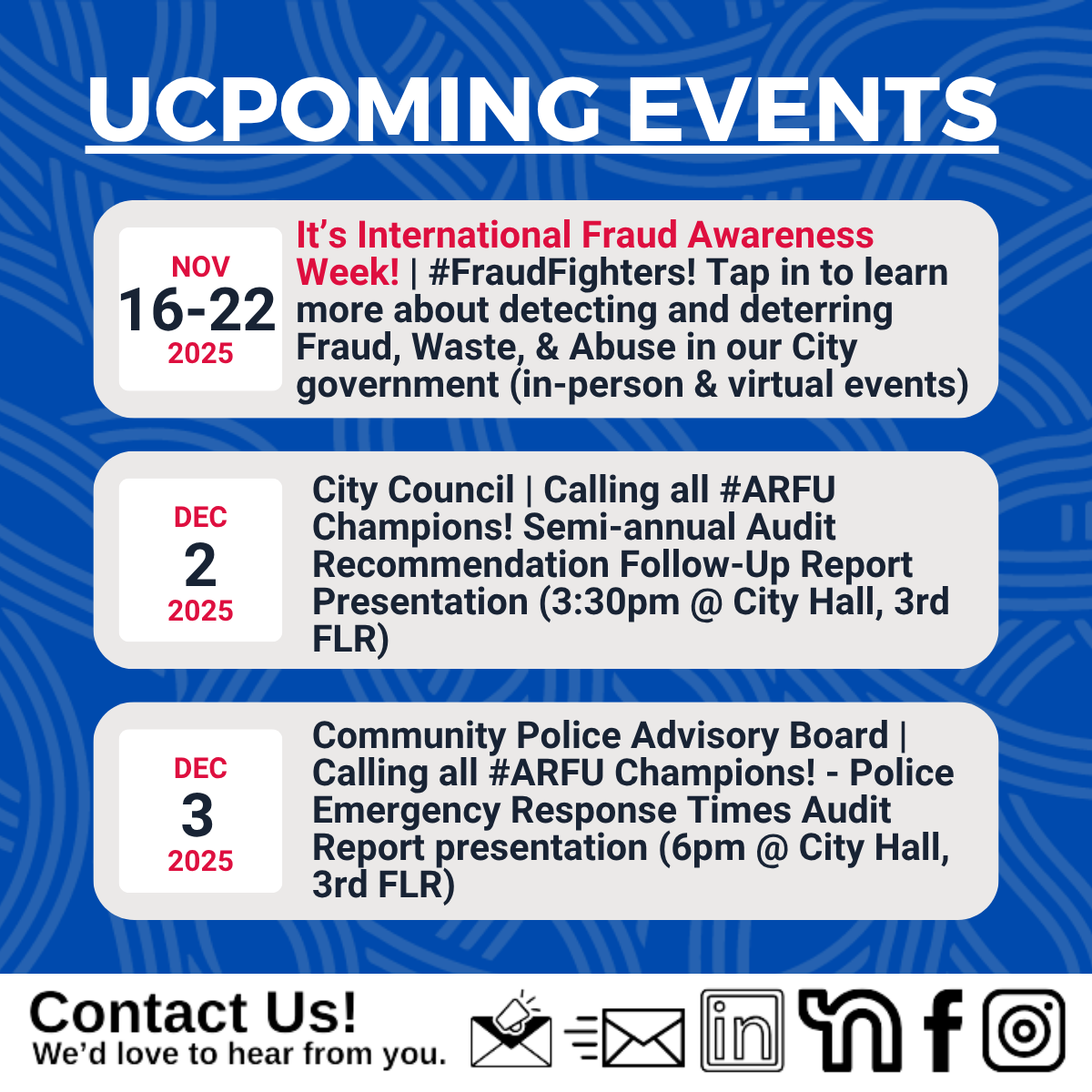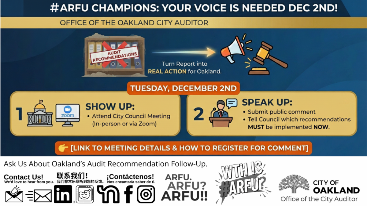 My Office joined the global effort to minimize the impact of fraud, waste, and abuse by reminding City employees about our Whistleblower Program, which seeks to detect, defend against, and deter improper activities within Oakland’s municipal government, and by hosting an interactive training session for the public and City employees.