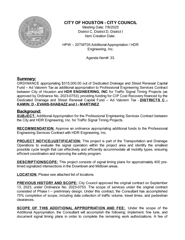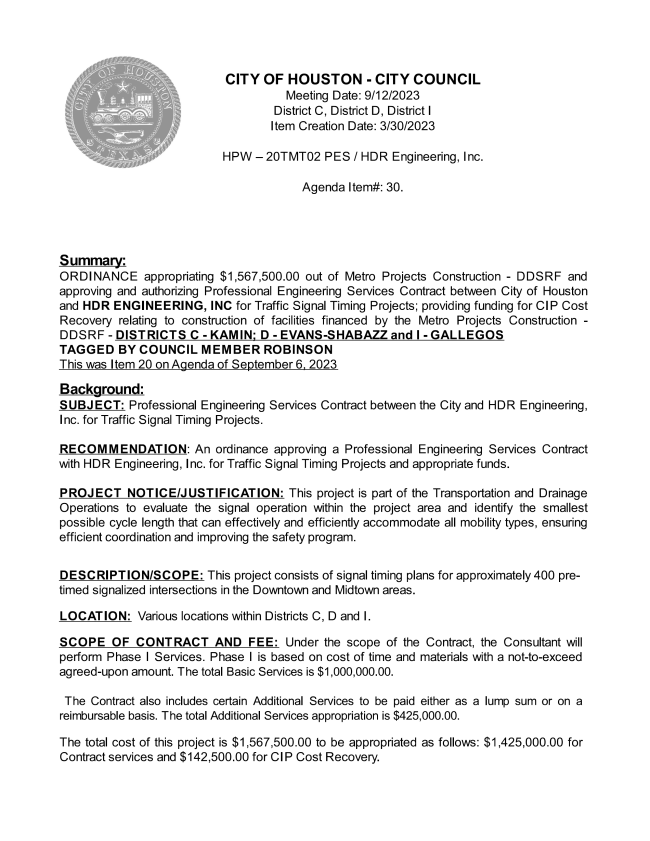 However, the last time the City retimed the signals downtown was in 2012. As a result, the timing had progressively deteriorated, leading to delays and numerous complaints from downtown commuters and business interests. In particular, Houston First raised concerns about the effect of crosstown traffic on the GRB Convention Center complex. In September 2023, the City Council, at the request of the Public Works Department, appropriated about $1.5 million to begin a major resynchronization. In July 2025, the City Council added $300,000 more to the project. Over that time, the City held meetings with downtown stakeholders on the retiming project.