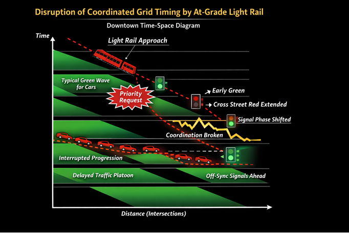 Any resynchronization of a grid is an exercise in balancing conflicting traffic flows. The idea is to “platoon” vehicles to move in a synchronized pattern, so they avoid each other at intersections and move through the grid with as few stops as possible. If the grid only has vehicular traffic, such synchronization is relatively straightforward. However, the introduction of at-grade light rail in downtown Houston greatly complicated the task of synchronizing the downtown signal grid. This is primarily because a platoon of vehicles moves through the grid largely without stopping, while trains must stop at their stations.