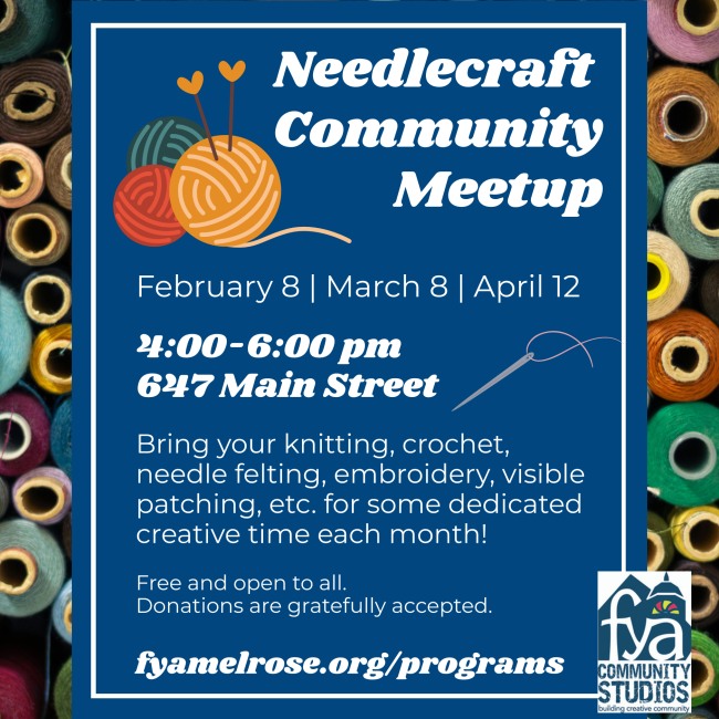 Join us for a community meetup! Bring your knitting, crochet, needle felting, embroidery, visible patching, etc. for some dedicated creative time each month.