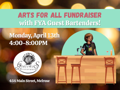 Come out to Giacomo’s Ristorante in Melrose for an evening supporting Arts for All, with surprise guest bartenders from FYACS! Funds raised will enhance our summer scholarships and adaptive assistance so more kids can be part of our summer programming.