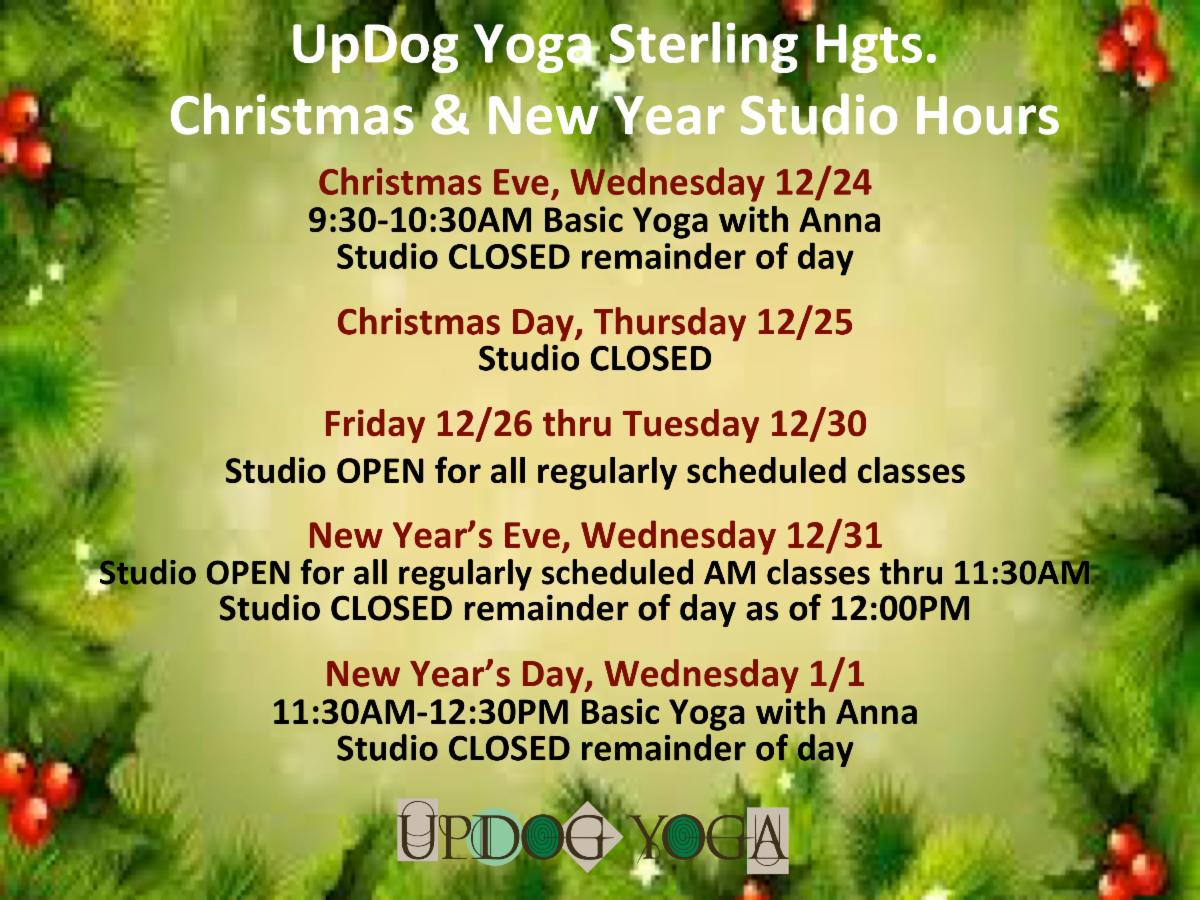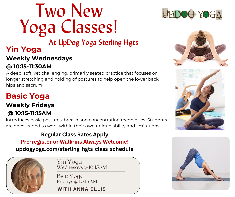 | | * Purchase online or in-studio thru January 17, 2026. 20-Class Pack activates on date of first use and never expires. Valid for all in-person, in-studio Yoga classes on the regular class schedule (does not include Kid's Yoga classes, workshops, or special events). Classes must be purchased separately for either studio location and do not transfer. Limit purchase of two (2) 20-Class Pack offers per person at discount price. Cannot be combined with any other offers or discounts. | | New Class Additions At UpDog Sterling Hgts. | | Saturday, January 24 in Rochester | | |