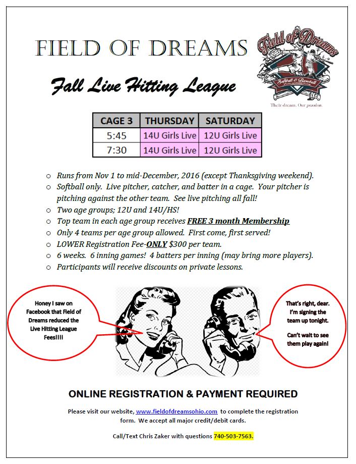 Don't forget that Field of Dreams is the perfect facility for your team's indoor training this winter. Get all of your practice dates and times booked before we are full. Rates vary based upon the amount of practices booked. Special payment arrangements may be made and discounts might be available.