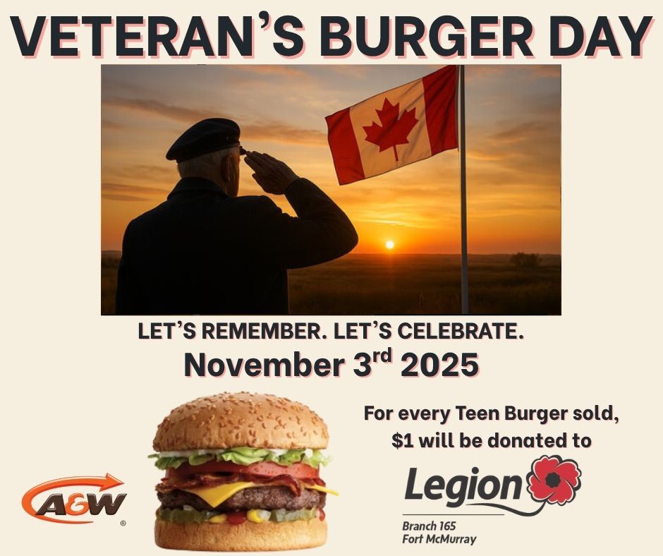For every Teen Burger sold at all 4 locations, $1 will be donated to the Fort McMurray Royal Canadian Legion, Branch 165.
