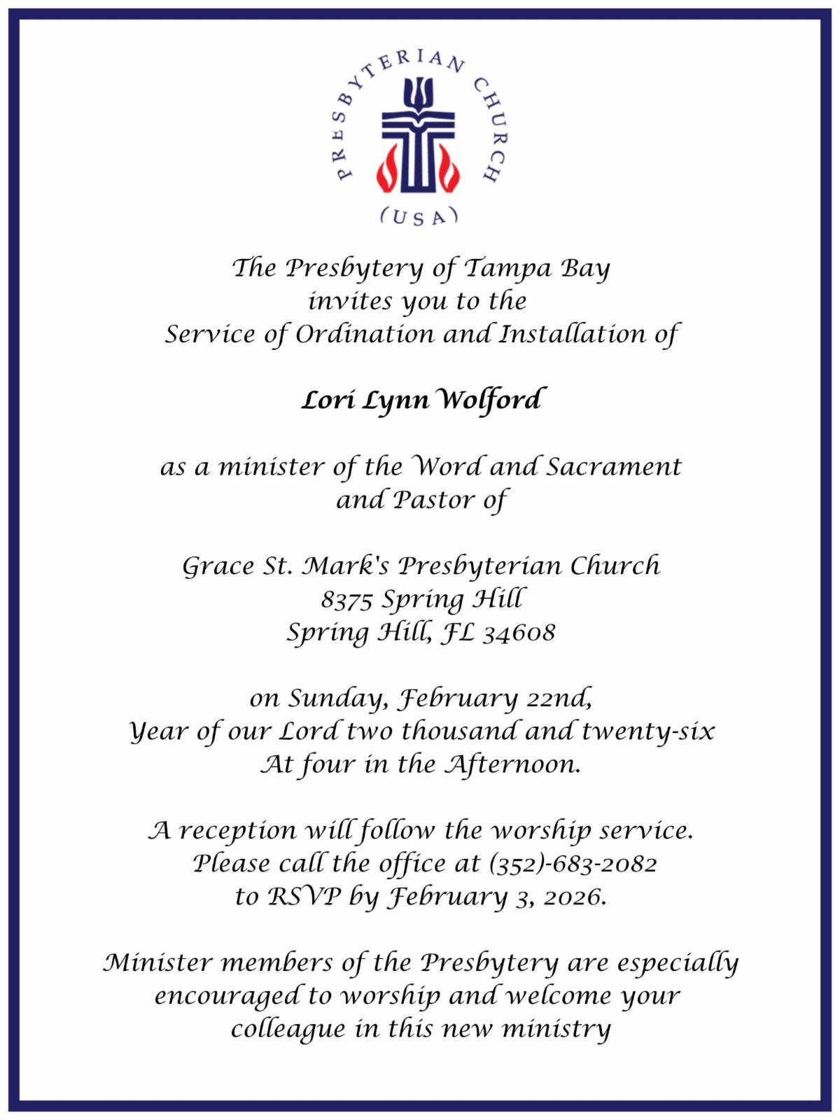 | | Ordination & Installation of Lori Wolford on February 22nd, 2026 at Grace St. Mark's Presbyterian Church | | Practical Resources for Churches - Free for The Presbytery of Tampa Bay! | | |