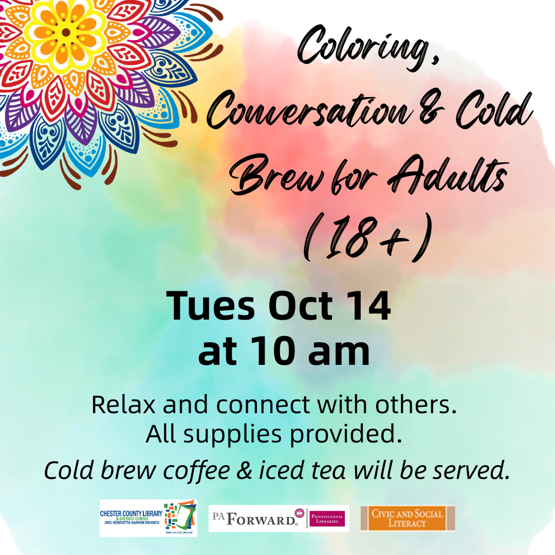 Relax and connect with others! Coloring is a great way to reduce stress and improve focus and concentration. All supplies will be provided, but feel free to bring your own if you wish! Hot coffee, tea, and cocoa will be served.