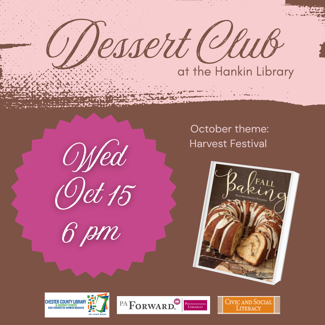 Welcome to Dessert Club, an adult program designed for individuals who love to make — and eat — desserts! Our October meeting theme is Harvest Festival. If you need recipe inspiration we suggest Fall Baking, Southern Harvest Favorites, currently on display at the Customer Service Desk.