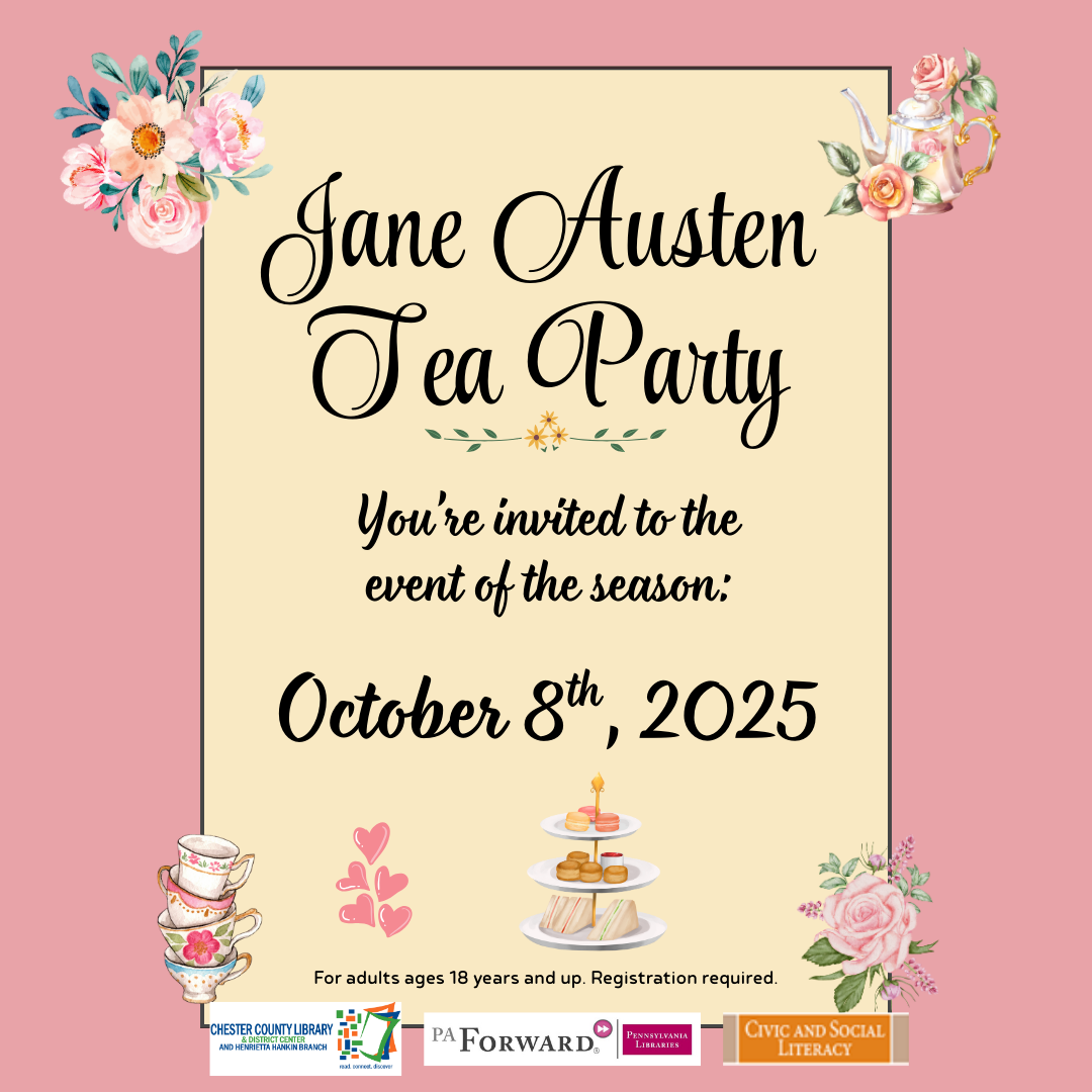 Step into the Regency era for a charming tea party inspired by the world of Jane Austen. Enjoy tea with light refreshments, period music, and spirited conversation. Feel free to dress in your finest Austen-inspired attire (optional) and test your knowledge with Jane Austen trivia and quotes. Perfect for fans of Jane Austen and all things witty and romantic.