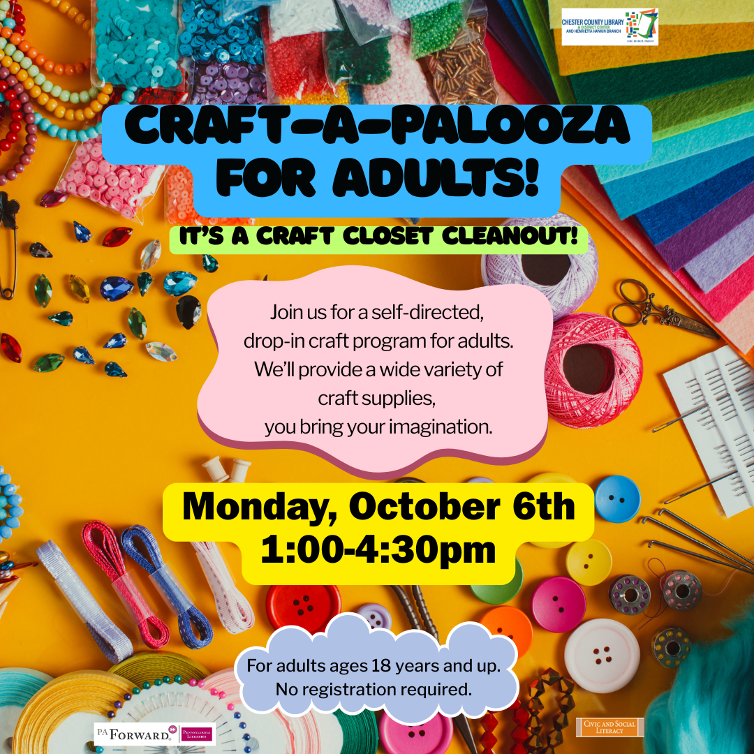 Join us for a self-directed, drop-in craft program for adults. We'll provide a wide variety of craft supplies, you bring your imagination. No registration required. For adults ages 18 years and up.
