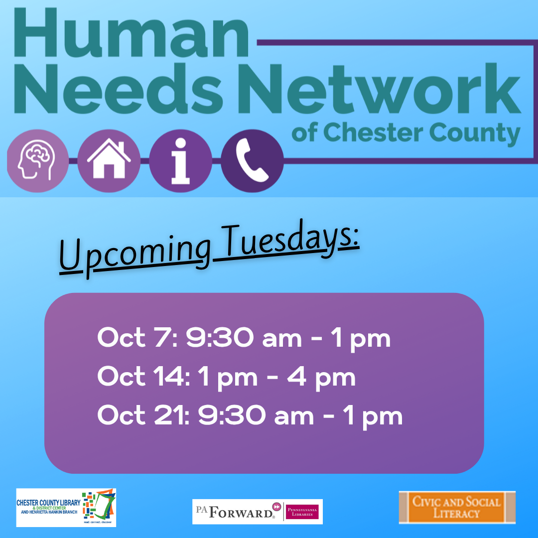 A representative from Chester County's Human Needs Network, part of the Chester County Department of Human Services, will be in the library on Tuesdays in September. Get help with health, housing, and human services. Walk-ins welcome. More information here.
