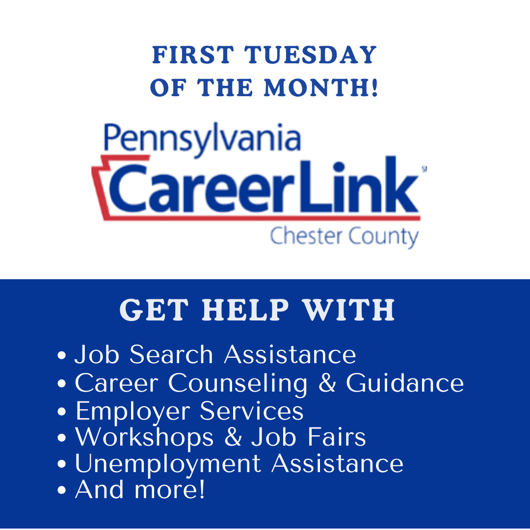 PA CareerLink provides employment support training opportunities to job seekers and employers within the Chester County labor market. Drop by for help with job search assistance, career counseling & guidance, employer services workshops, job fairs, unemployment assistance and more. No reservation required.
