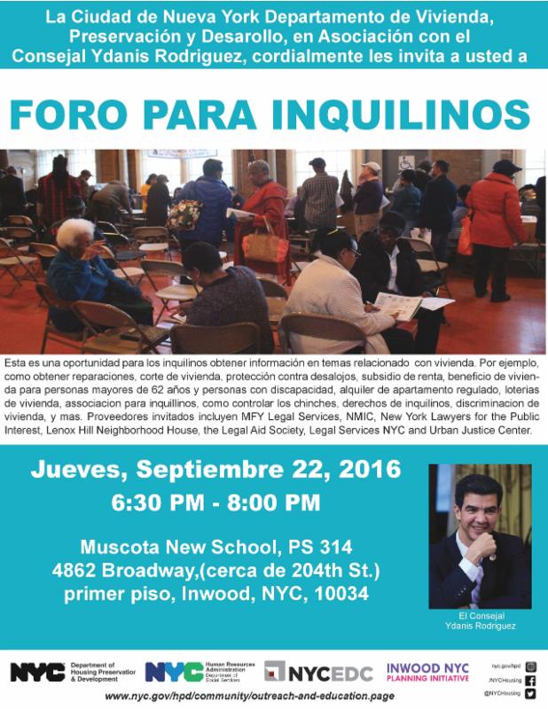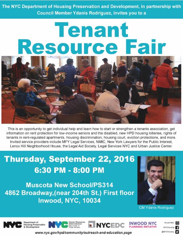 I also wanted to remind you that on Thursday evening, my office is co-hosting a tenants' resource fair where city agencies will be present and available to answer questions and offer support around tenant issues. On Sunday, we will also be co-hosting a full community service fair with a number of providers and city agencies, capable of responding to numerous concerns.