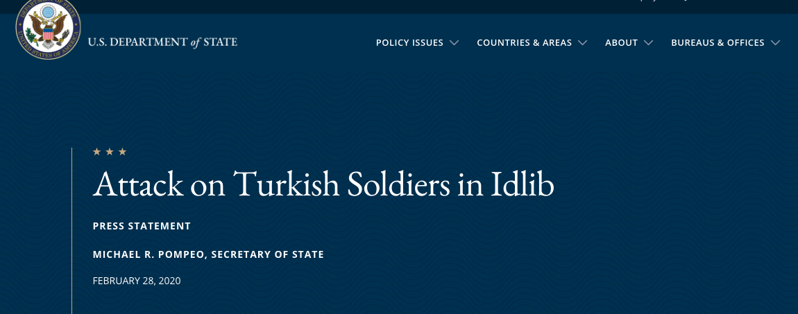 Press Statement by U.S. Secretary of State Pompeo on the killing of Turkish soldiers in Idlib:READ THE FULL STATEMENT HERE