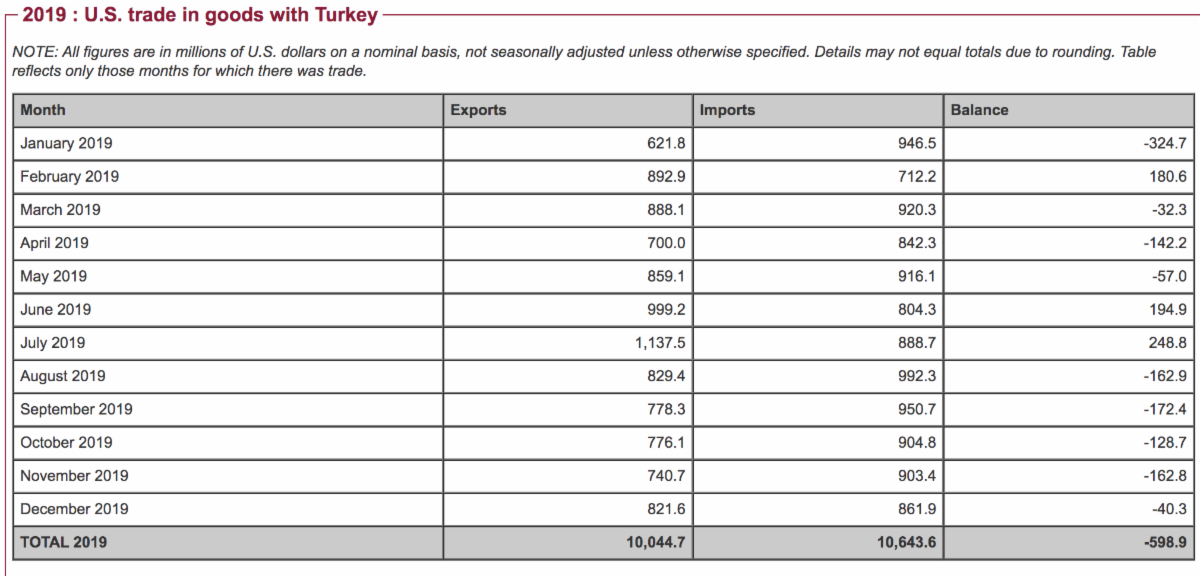 U.S.-Turkey trade notches a modest increase in 2019 year at $21 billion, According to US Census data, Turkey exports to US increased %3 (10.6 billion $) and imports from US decreased 2% (10 billion $) compared to previous year.