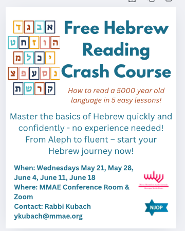 Apologies for the oversight! The Hebrew Reading Crash Course is scheduled for 7:45 PM tonight. We’d love to see you there!