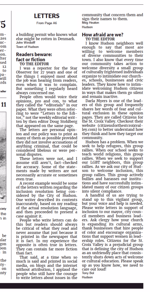 in rebuttal to these two letters to the editor printed last week, written by Meg Heaton and Tony Bol. The direct e-mail for a letter to the editor is Sarah Young
