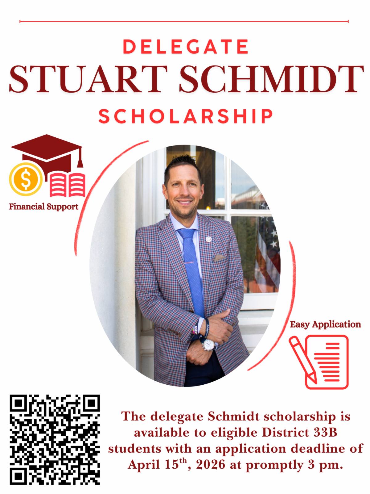 The Delegate Stuart Schmidt Scholarship is open to eligible students residing in District 33B, with applications due by April 15, 2026.