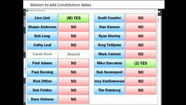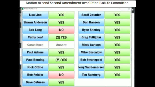 Explanation: Robert Feidler, Vice-Chair, offered for discussion a procedural Reconsideration of the Motion. What that means is that someone who voted Yes to the Motion to send the Second Amendment Resolution back to Committee would need to ask for a Reconsideration of the Motion. Robert Long, Chair, and Robert Feidler, Vice-Chair, voted No to send the Resolution back to the Committee. It’s worth listening to the discussion following Feidler’s attempt to have the motion reconsidered. None of the prevailing Yes voters chose to offer a Reconsideration to the Motion.