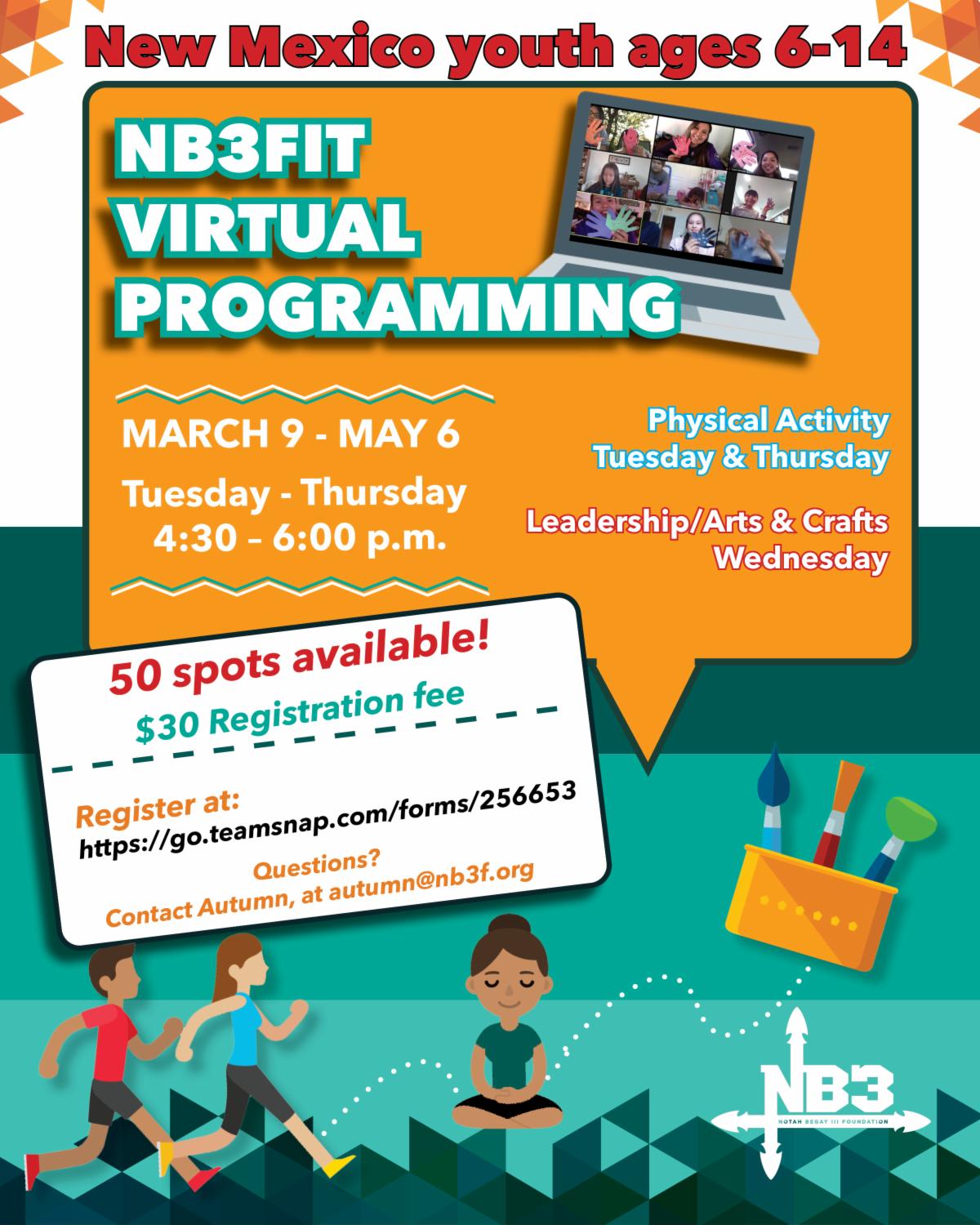 NB3FIT Virtual Youth Programming will run from March 9 - May 6 and is open to children ages 6-14 who reside in New Mexico. Programming takes place Tuesday, Wednesday and Thursday from 4:30 to 6 p.m. Youth will interact with NB3FIT coaches and peers as they explore activities that promote physical activity, healthy nutrition, youth development and cultural connections.