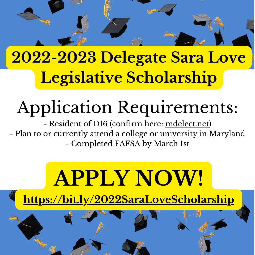 Delegate Sara Love's Legislative Scholarship. Each year, Senators and Delegates in the Maryland General Assembly (MGA) receive scholarship funds through the Maryland Higher Education Commission (MHEC) to award to their constituents. My scholarship is available to students who live in the 16th Legislative District (visit http://mdelect.net/ to check your district) and who will be attending a Maryland college or university, graduate school, or private career (or vocational) school either full or part-time. Students who attend out-of-state schools and qualify for a “unique major,” as determined by MHEC on www.mhec.state.md.us, may also be eligible for scholarship funding. Priority will be given to students with demonstrated financial need.The 2022 application is now live here.