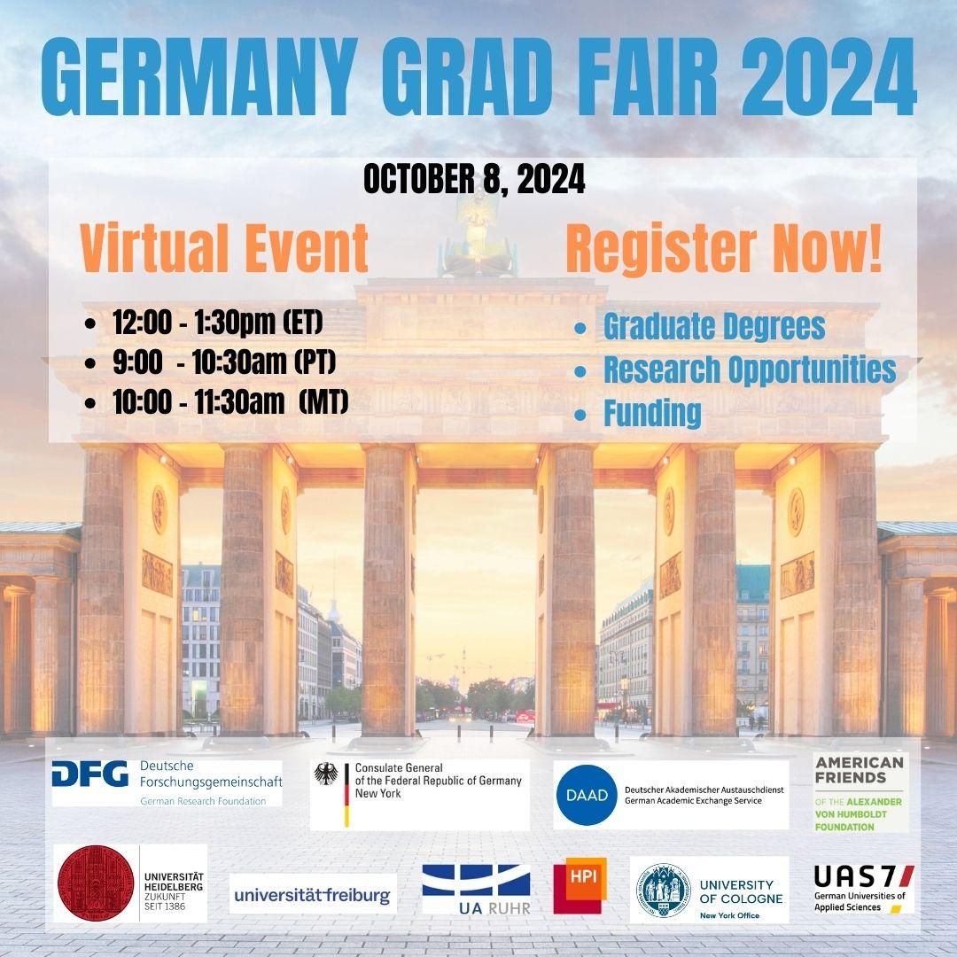 Thinking about graduate school? Come learn what opportunities await you in Germany! The Germany Grad Fair 2024 is your pass to exploring the exciting opportunities for research, funding, and career advancement through graduate studies in Germany. Meet with representatives from universities, funding and exchange institutions, and the German consulate who will be happy to answer your questions, and learn from our panel of alumni and professionals what doors a German graduate degree can open for you.