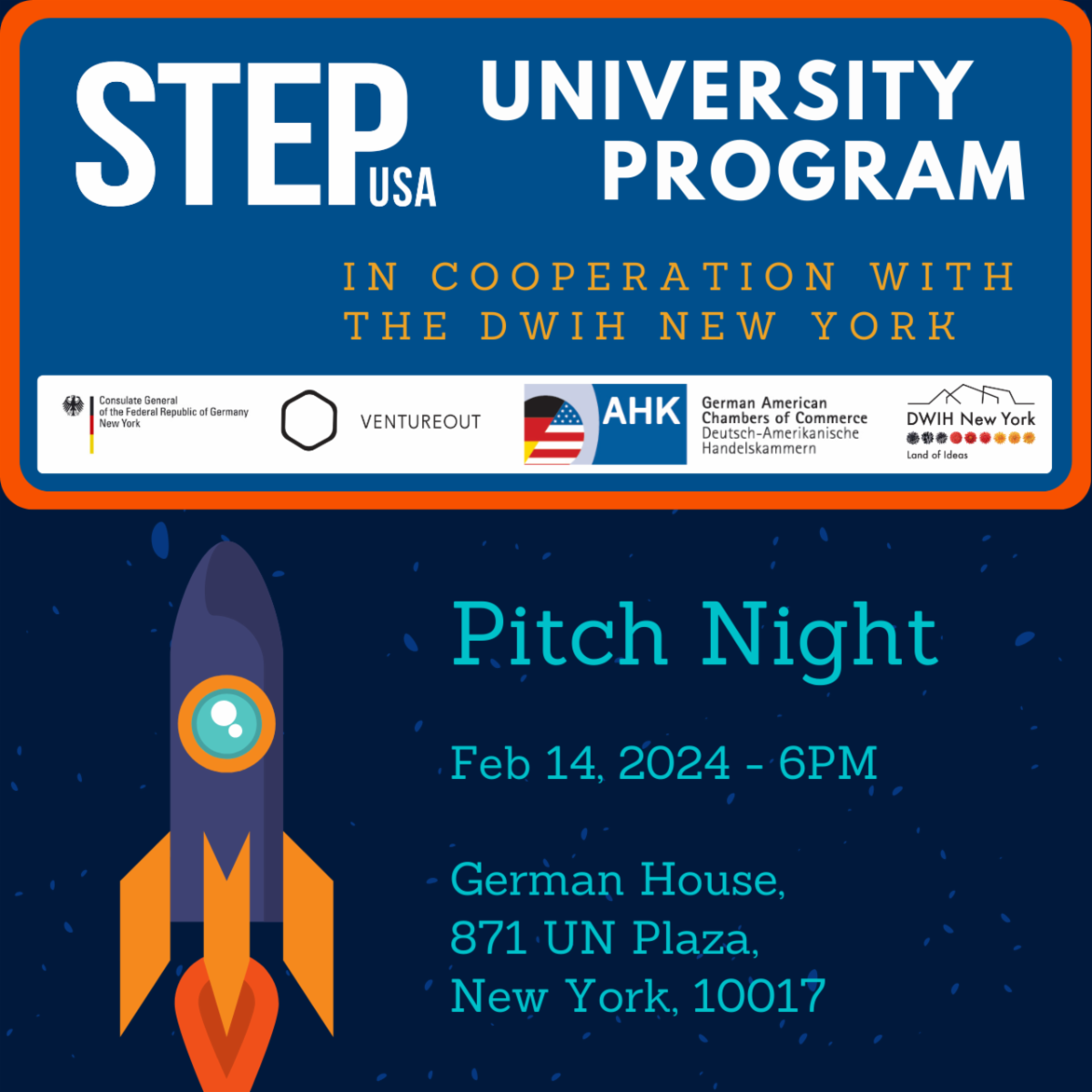 The German American Chamber of Commerce, Inc. (GACC), the DWIH New York and the German Consulate General New York are excited to host the STEP USA University Program Pitch Night on Wednesday, February 14th, 2024! They are proud to welcome a startup cohort from Germany to the Startup Entrepreneurship Program (STEP USA) in New York to a 3-day strategy development boot-camp supporting promising German startups and their expansion to the US. During the famous STEP USA Pitch Night at the German Consulate General New York, the cohort will present their ideas to potential customers and partners, followed by time to network over snacks and drinks. A jury consisting of venture capital investors will be providing direct feedback.