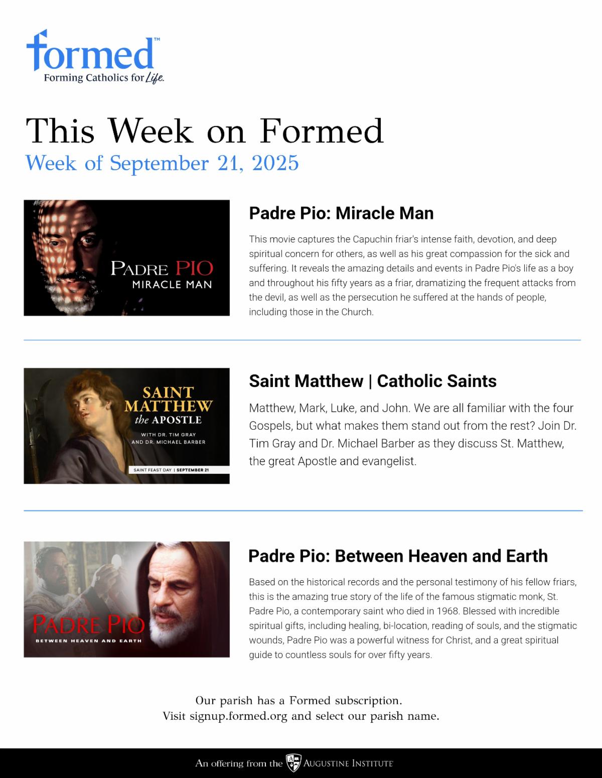Our parish has a subscription to FORMED, a premier online platform filled with over 4,000 Catholic studies, movies, audio dramas, talks, e-books, and even cartoons for our children. FORMED has content from over 60 apostolates, including Augustine Institute, Ignatius Press, and the Knights of Columbus, with material that is professionally produced, engaging, and solid in its catechism. Best of all, this material is free to you because of our parish subscription.