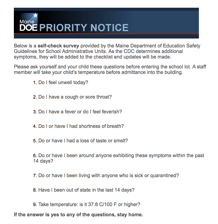 Thank you for continuing to perform the daily check before coming to school! Together, we can continue to keep one another safe. As always, if you have an uncertainty regarding any of the questions on the checklist below, please call our office to discuss before coming to school: 207-865-3308