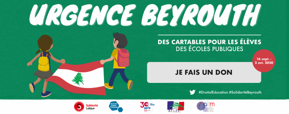 Helping students in Beyrouth. After the terrible disaster that occurred on August 4, 2020 in the Lebanese capital, the AEFE joins forces with non-for-profit organizations: Solidarité Laïque, the MLF, the AFLEC and the Union ALFM to support a fundraiser in favor of the students of Beirut's public schools and thus enable them to be equipped for the coming school year.