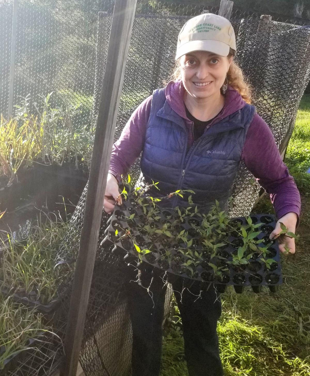 We set up two nursery tables in a sunny location at Mill Bend Preserve, where the plants could grow until planting time. We followed best management practices to prevent Phytophthora, a microscopic water mold whose name means “plant destroyer” in Latin and was the primary cause of the Irish potato famine. Phytophthora thrives in wet conditions, causes devastating root rot, and can be lethal to native plants. Because it spreads through water, soil, and contaminated equipment, prevention during wetland restoration is critical. Our measures included keeping plants off the ground and on tables; sterilizing all containers, racks, tools, and surfaces; and sanitizing hands before handling plants. We also heat-treated soil in batches, keeping it above 122 degrees Fahrenheit for 30 minutes—careful not to overheat it, which could alter mineral content and harm plant growth.