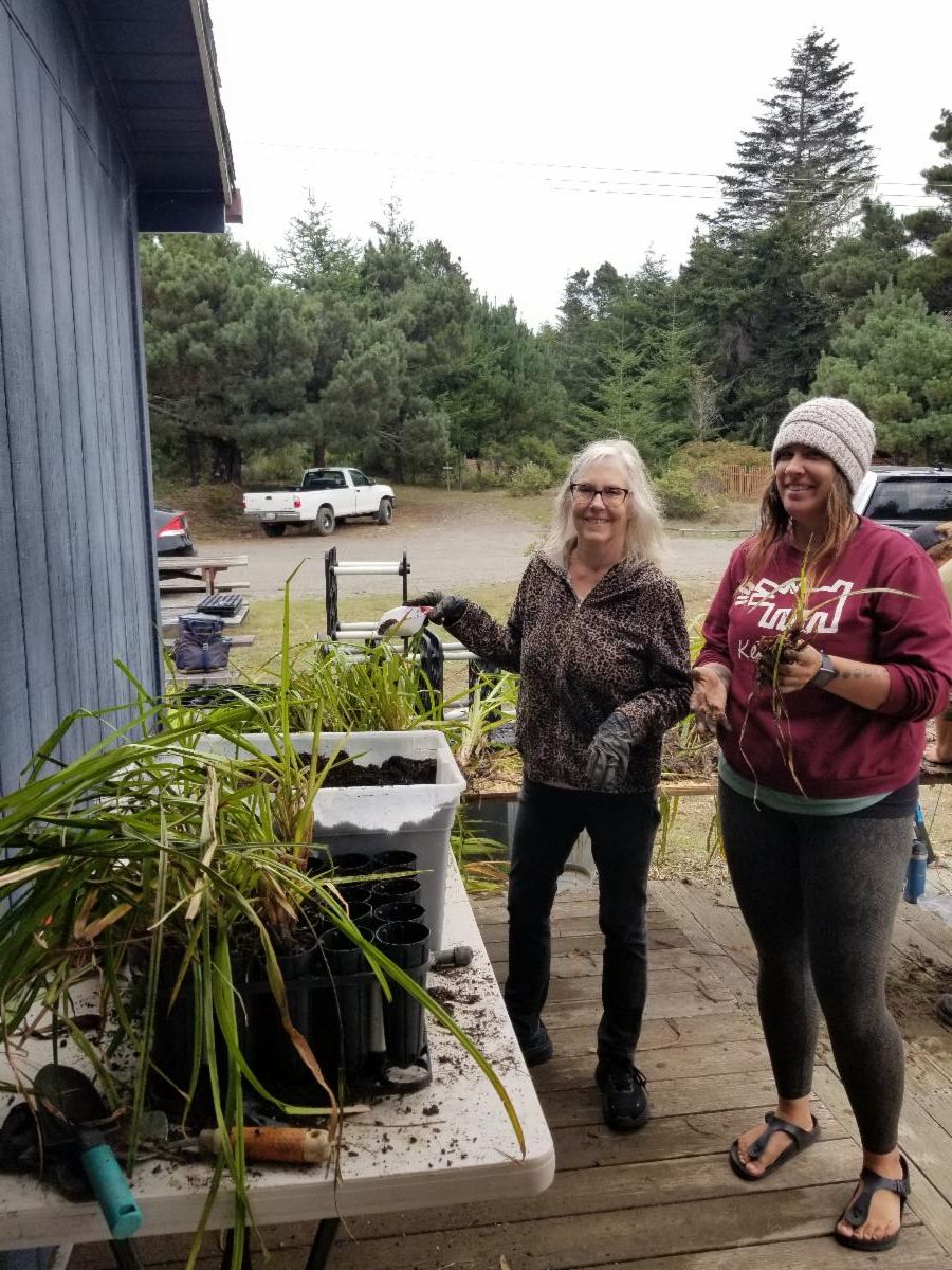 Due to the short timeline, growing plants from seed was not an option. Instead, we dug small clumps containing numerous seedlings and carefully divided them. Volunteers spent a morning potting hundreds of plant divisions into restoration containers generously lent by Mendocino Coast Botanical Gardens. For some species, propagation by cuttings was more appropriate; in these cases, only one cutting was taken per plant to preserve genetic diversity.