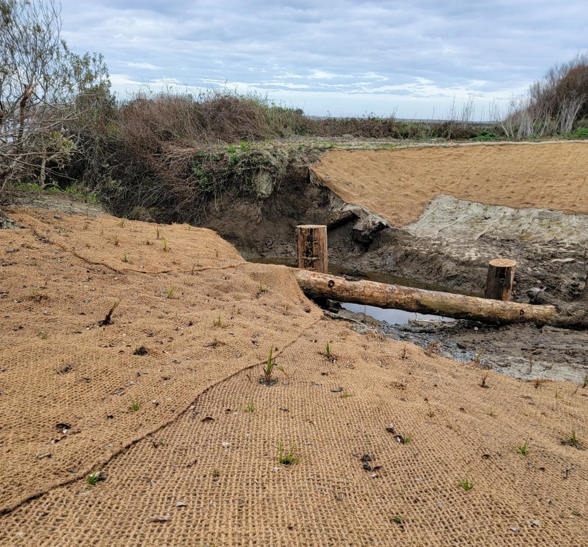 From several hydroseed mixes, Sophia Pisciotta, RCLC's stewardship director, selected one containing only native plants suited to this area. Lauren Hammack from PCI advised the planting team to apply jute netting over the hydroseeded areas and cut holes for the plants. In total, approximately 685 plants were installed in December, with another 400 planned for planting this month. The upper access road was also hydroseeded to support native reestablishment and will receive container-grown native shrubs this month to further boost revegetation. We also expect the coyote brush that was cut back to resprout.