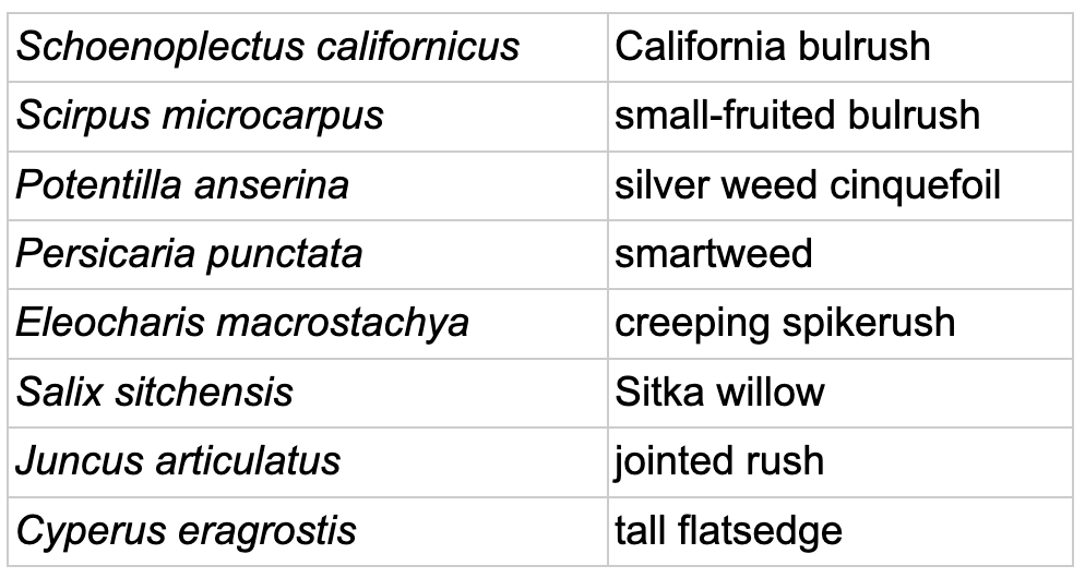 In coordination with biologists from Caltrans and North Coast Resource Management, we assessed the plant species and quantities needed to revegetate the China Gulch outlet once construction was complete. We prioritized site-specific plants—those sourced from the same location where they will be planted—which is considered best practice for restoration. Because plants adapt to their microclimates, and environmental conditions can vary greatly even within a few miles, site-specific plants are most likely to establish and thrive. Working with CDFW, we located plant material at a nearby site at the same elevation as the recontoured channel outlet, including marsh plants such as bulrush, flatsedge, and smartweed that live partially submerged in water.