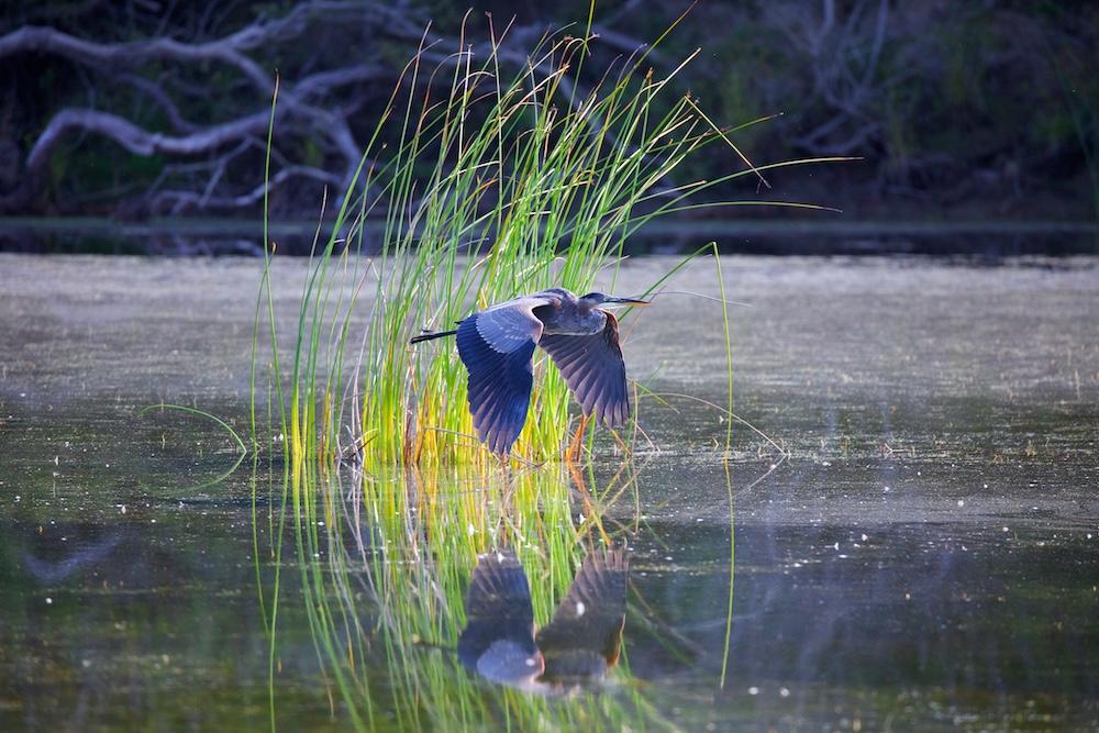 This stunning photo is of a great Blue Heron flying over the Gualala River.
