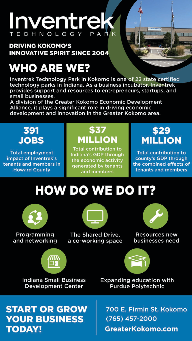 Connect with the Greater Kokomo Economic Development Alliance inside Inventrek Technology Park, 700 E. Firmin St., Kokomo.