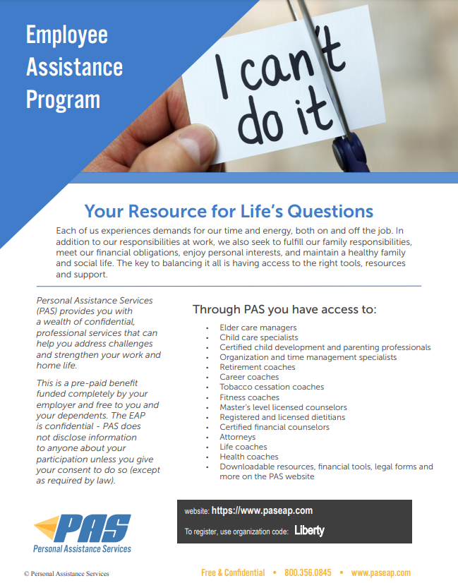 Our new EAP Provider, Personal Assistance Services (PAS) provides a wide array of counseling and life coaching services to support you and your dependents through the full spectrum of life events. PAS helps enhance well-being at any stage of life.