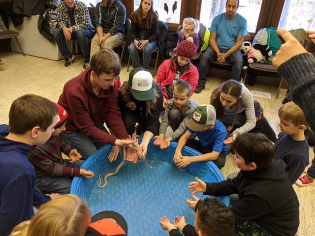 , 2019 Upham Woods hosted an Animal Expo Day in collaboration with the Dells/Delton Parks and Recreation Department. Forty-two people came to learn about reptiles and amphibians! Here at Upham Woods we have several resident animals that we use in our classes to help teach about their wild cousins here in Wisconsin. At Animal Expo Day we introduced the community to Beauty the red-tailed hawk, Larry and Midge the three toed box turtles, Big Mama, Little Mama, and Junior the painted turtles, Aldo the leopard gecko, Popcorn the albino corn snake, Leche the Honduran milk snake, and Igor the common snapping turtle. Getting hands on experience with these animals is important for people of all ages to connect protecting the environment with protecting the lives of the unique animals who live there. Beauty, Igor, and the painted turtles are all native Wisconsin species. The snakes and the box turtles are native to other areas but make great ambassadors for our native snakes and box turtles here in Wisconsin. In addition to meeting our program animals we had a competition between the adults and the kids to see who could correctly identify characteristics of reptiles and amphibians. The adults won, much to the kids chagrin.