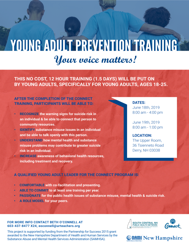This two-day training will help young adults to better understand the warning signs for suicide, substance misuse and mental health concerns so that they can help others find treatment and recovery options.