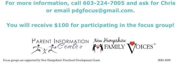If you are a parent or primary caregiver of a child younger than 7 years old, we invite you to participate in one of our research focus groups to help us better understand what services parents of young children are using, what their experiences are like, and how experiences can be improved for New Hampshire children and families.