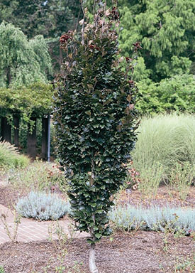 Handsome columnar tree with deep purple crinkled foliage all season long. Slow growth habit and narrow form make it ideal for smaller landscapes. The Red Obelisk Beech can be used as a striking vertical accent or a specimen tree in most any setting. Smooth, silver bark contrasts perfectly against the purple leaves, making for an attractive winter interest even after the leaves fall. This tree thrives in a full sun setting with regular watering-especially in extreme heat.