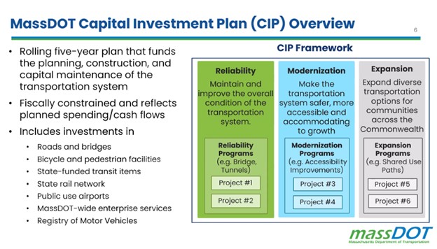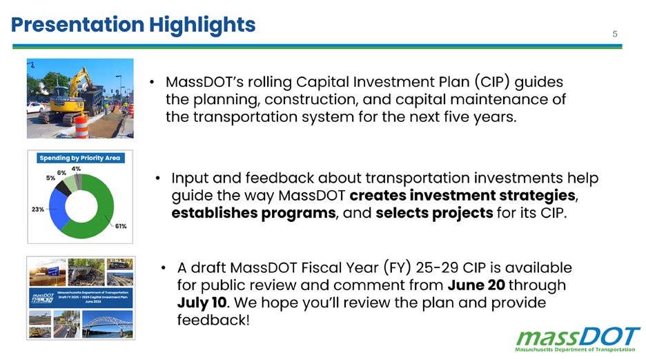 Speaking of critical transportation investments, this Monday (July 1) I testified at a public hearing on MassDOT’s 2025-2029 Capital Investment Plan (CIP). The CIP is a rolling five-year framework that proposes allocating state and federal funds to communities for long term improvements to the transportation system.