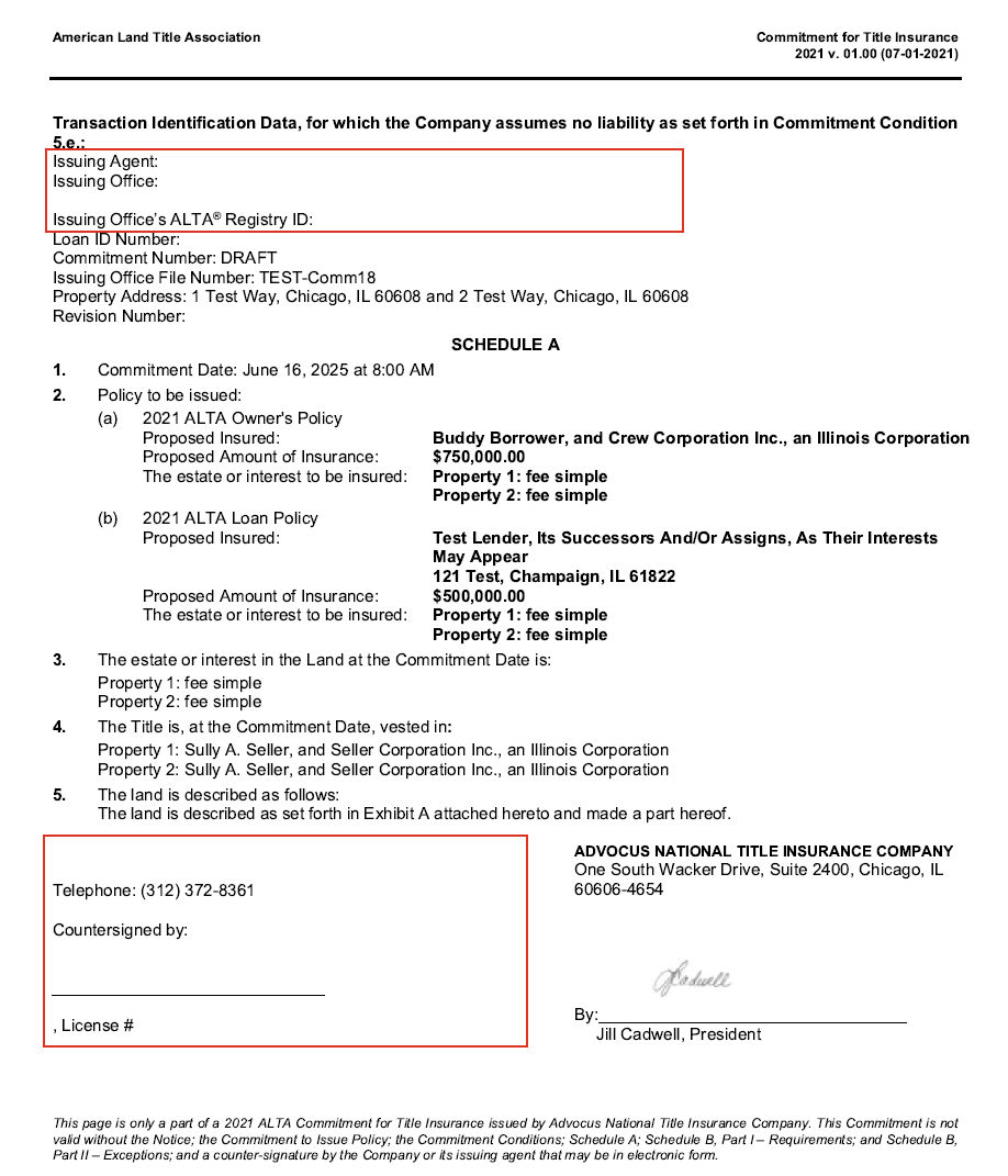 We learned yesterday afternoon that agent information is not populating in the Transaction Identification Data section at the top of Schedule A or in the agency countersignature block at the bottom of Schedule A of Title Commitments issued in Qualia Core. See sections boxed in red in the screen shot below from a test file we generated in Qualia Core this afternoon. This issue appears to impact all Title Commitments issued by agents in Qualia Core. This does not appear to impact any other title products (policies or closing protection letters). We have reported this bug to Qualia Support and are working to get this resolved. We will update you once this issue has been fixed.