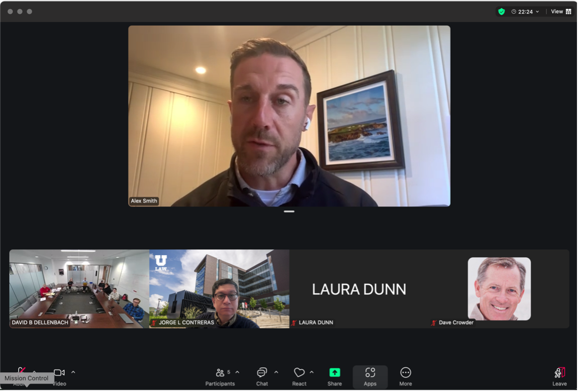 Adjunct Professor Dave Dellenbach surprised his Trademark Law class in April with a guest zoom appearance by Alex Smith, former NFL starting quarterback for the San Francisco 49ers, Kansas City Chiefs and Washington Redskins. Smith was an undergraduate at the University of Utah, where he led the Utes to victories in the 2003 Liberty Bowl and the 2005 Fiesta Bowl. He spoke with Prof. Dellenbach’s class about name, image and likeness (NIL) rights for college athletes. Smith was joined by long-time sports manager Dave Crowder, who also shared his insights with the class.