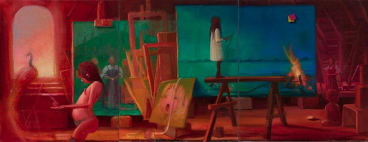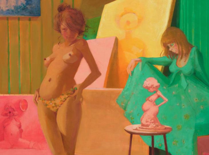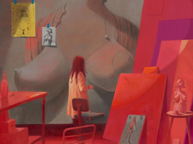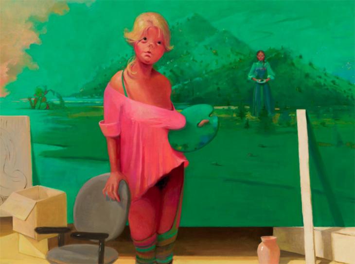 | | Lisa Yuskavage, “Endless Studio,” 2024, oil on linen, triptych, 12 x 31”. All images courtesy of David Zwirner, Los Angeles. | | In Yuskavage's paintings, the studio becomes a stage onto which scenarios are projected. In the monumental work “The Artist's Studio” (2022) — also reproduced on a giant billboard adjacent to the facade of the gallery — a cherub-faced half-nude girl stares out of the painting, dressed in a tight-fitting but also draped pink t-shirt that covers the upper portion of her body. She also wears colorful striped knee-high socks, exposing her bare thighs. She holds a bright green painter's palette that suggests, curiously, she is both artist and model. Behind her is a large painting of a landscape filled with green hills, a few orange clouds, and a single female figure — a peasant character from an earlier work, “Nel'zah’s” (2012) — offering a green plate. Toward the back of the studio, a woman sits at a table reading a book. Miscellaneous ladders, props and unfinished paintings are scattered in the space, all with gray, tan, or light brown hues, in contrast to the more finished and vivid depiction of the figure in the landscape. | | Lisa Yuskavage, “The Artist’s Studio,” 2022, oil and charcoal on linen 86 x 120”. | | From the Renaissance to modern times, self-portraits of the artist at work in their studio have been a common subject, as the model is an ever-present option. In some ways, Yuskavage follows in this tradition, inserting herself and prior artworks into her recent paintings. But Yuskavage often poses an ironic challenge or provocation. “Painter Painting” (2024) is a large-scale oil with the artist at its center, her back to the viewer. She is in the midst of creating a grayish portrait of a doll-like woman with huge breasts. The painting within the painting dwarfs the artist, whose head is smack in the middle of her subject's cleavage. Two sketches/studies of nudes are adhered with blue tape to the painting in progress. A small sculptural maquette of the naked woman in the painting is placed on a stool nearby. Older works surround the artist, alerting us that Yuskavage is mining her past for inspiration. | | Lisa Yuskavage, “Painter Painting,” 2024, oil on linen, 94 x 77 1/4”. | | The artist at work is absent in “In the Company of Models” (2024). While the studio setting is similar to that of “Painter Painting,” Yuskavage here presents not as a painter, but rather a younger version of herself as a model who emerges from a bright green wall in a like-colored dress. Though legless, her body position suggests the beginning of a formal dance. The central figure — a seductive female nude wearing nothing but beaded panties — is surrounded by stacked depictions of Yuskavage's past paintings, such as the bright yellow “Rorschach Blot” (1995). |
