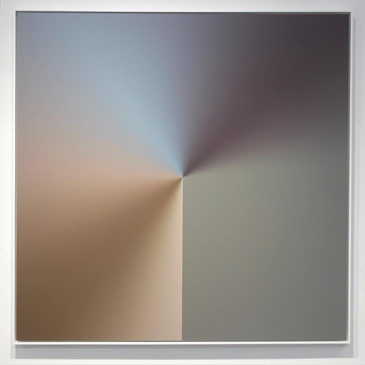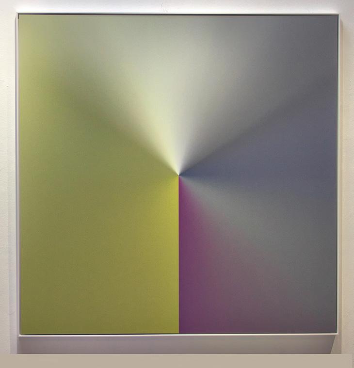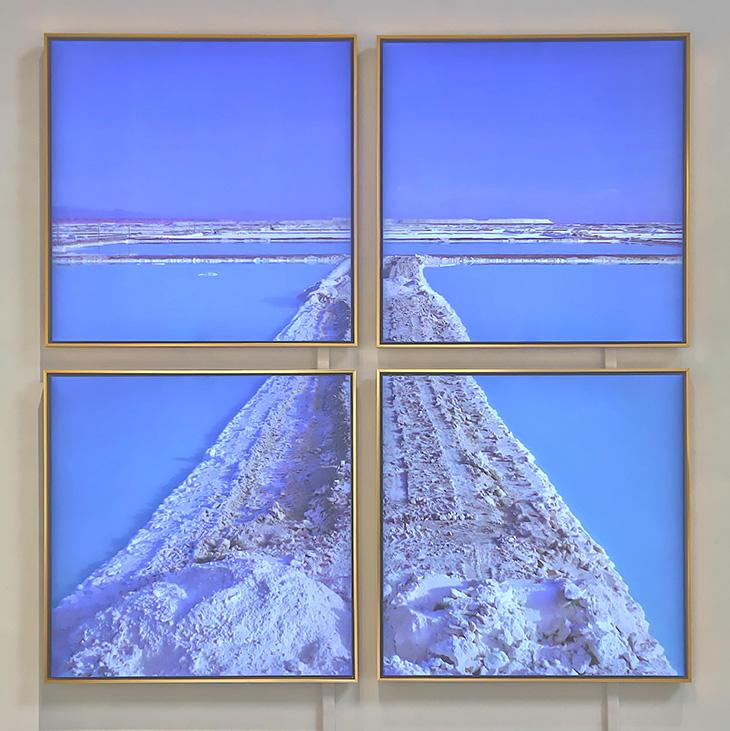 The admiration for paintings so ultra-realistic that they simulate photographs is given a witty reversal in Davey Whitcraft’s conceptual abstractions comprising “To Those Who Create the Future.” Whitcraft’s striking images — to all appearances tours de force of immaculately blended oil paint — turn out to be unframed, Dibond-mounted, square-format photos the size of medium canvases (from 36 x 36” to 60 x 60”). In a kind of sociopolitical camouflage, they mimic the look of ‘flat’ 1960s abstraction. Could they mark a return to art for art’s sake, a time when representation and message art were considered irrelevant and retrograde? Dressed up in such aesthetic disguise, Whitcraft gives us subject matter of disquieting contemporary import: lithium mines in the Atacama Desert along the coast of Chile; the landlocked and toxic Salton Sea in the Coachella Valley; and the oil fields of the scorching Mojave Desert. Of particular interest to Whitcraft is the Atacama lithium deposit, nationalized by Chile in order to protect it from experienced Russian and American strip-mining companies.