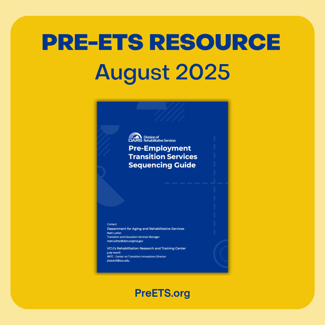 Connecting students to DARS as early as 14 is a fantastic way to ensure a smooth transition into life after high school. This Fast Fact explains the continuum of transition services DARS offers as students move from high school to post-secondary opportunities. Check out the DARS Continuum of Transition Services Fast Facts today to learn more. And if you're not sure where to start, the Pre-ETS Sequencing Guide was designed to help educators, DARS Counselors, and Pre-ETs providers figure that out. Use this guide as a tool to help plan out Pre-ETS services based on where your student currently is in terms of skills and knowledge. The guide can also be used to drive the path for sequence of services for the transition team. Download and save the Pre-ETS Sequencing Guide to learn more.