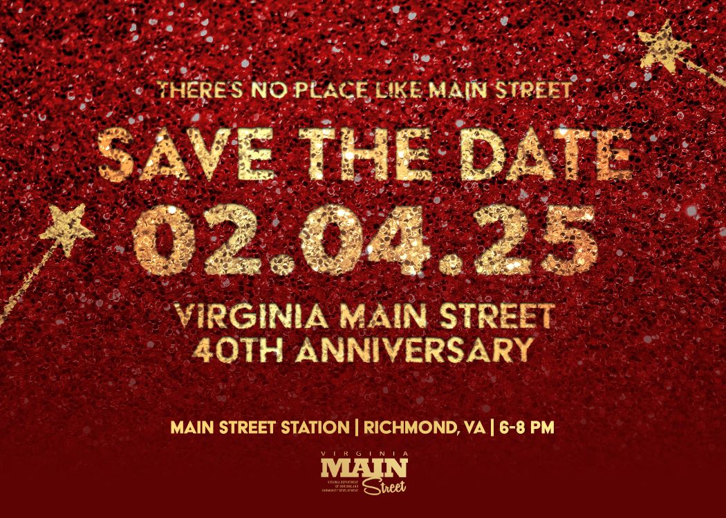 Virginia Main Street 40th Anniversary - Save the date and plan to join Virginia Main Street (VMS) at the historic Main Street Station in Richmond, Virginia to celebrate 40 years of fostering vibrant, resilient, and thriving downtowns and commercial business districts across the Commonwealth!